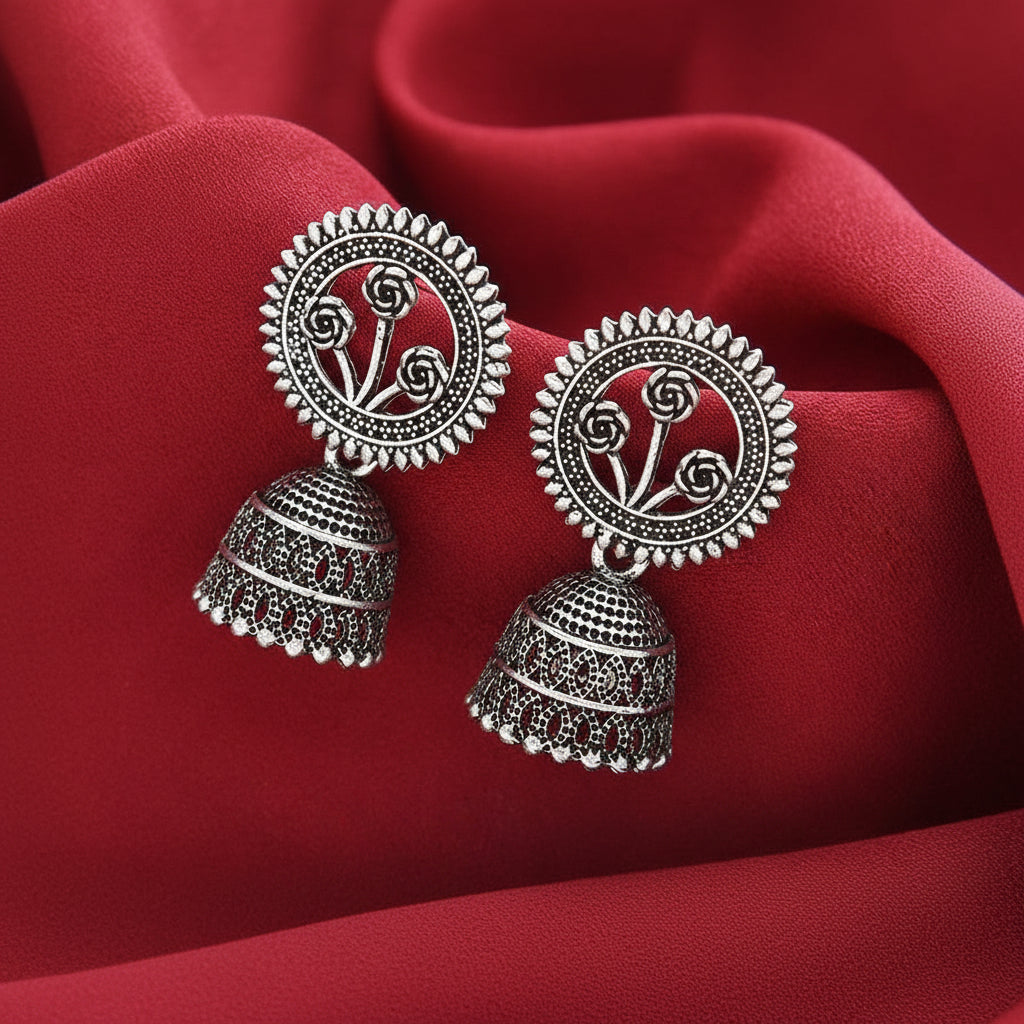 • Dual pair of oxidized silver jhumkas combining heritage aesthetics with contemporary versatility.