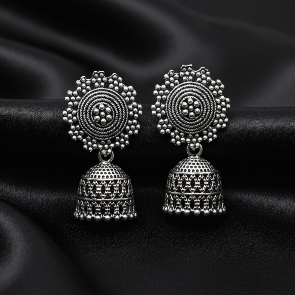 Antique Oxidized Silver Jhumki Earrings for Women featuring Carved Round Stud and Detailed Dome.
