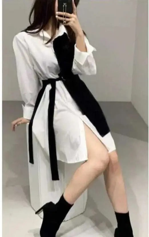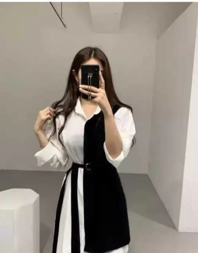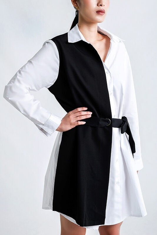 Trendy Dual-Tone Black and White Shirt Dress – Stylish Belted Tunic Dress for Women