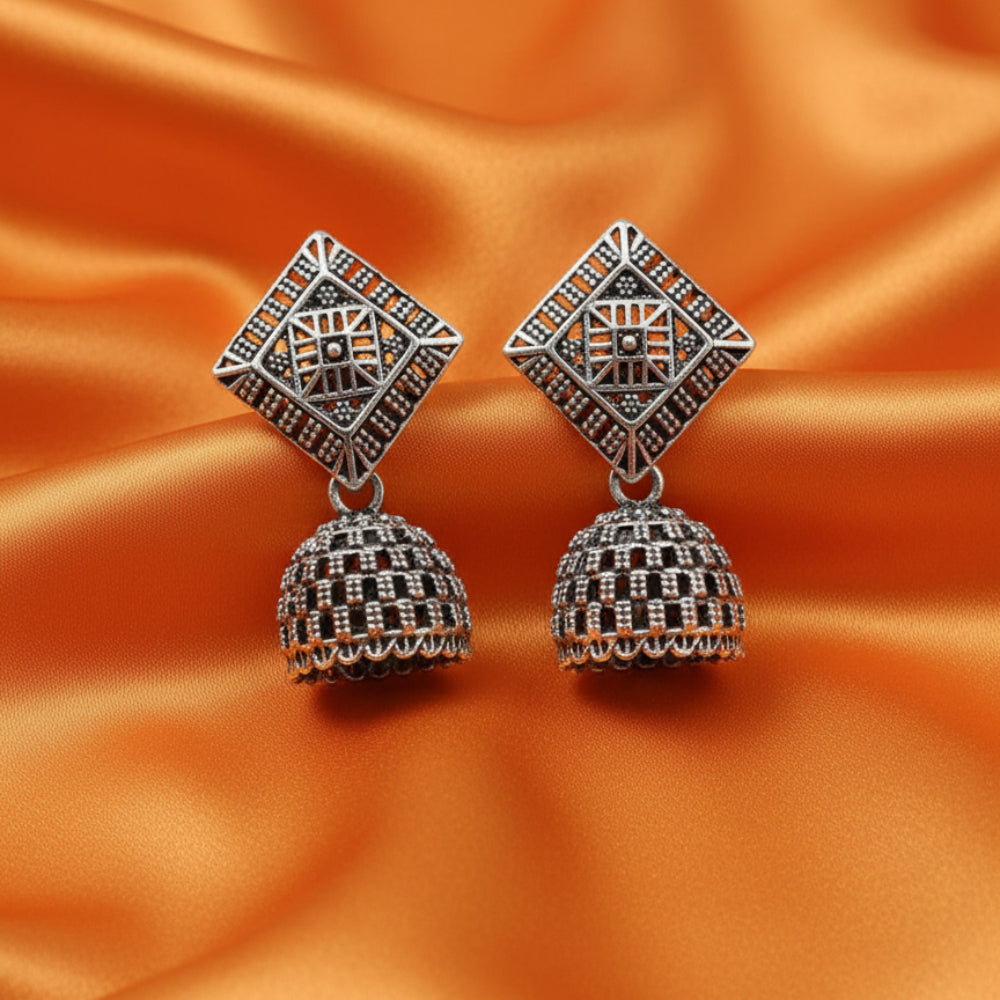 Vintage Oxidized Silver Square Pattern Jhumka Earrings with Carved Dome for Women.