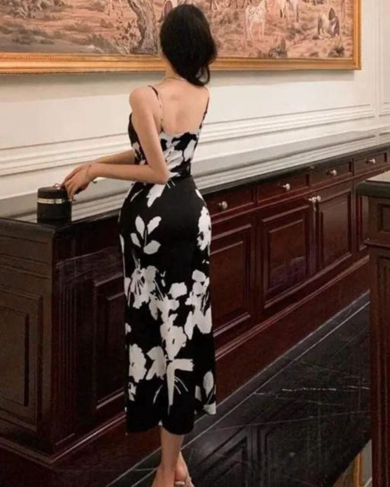 Women’s Black & White Floral Print Spaghetti Strap Bodycon Midi Dress