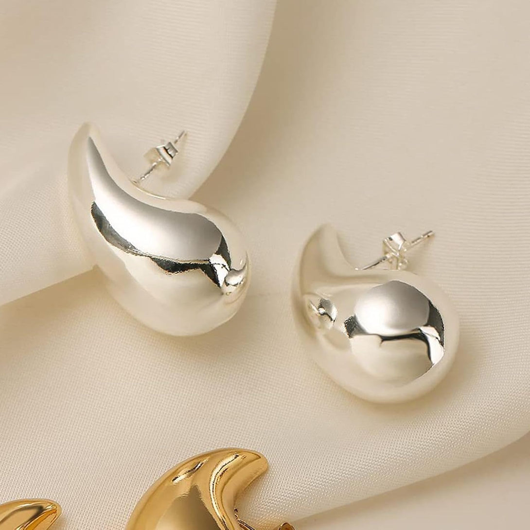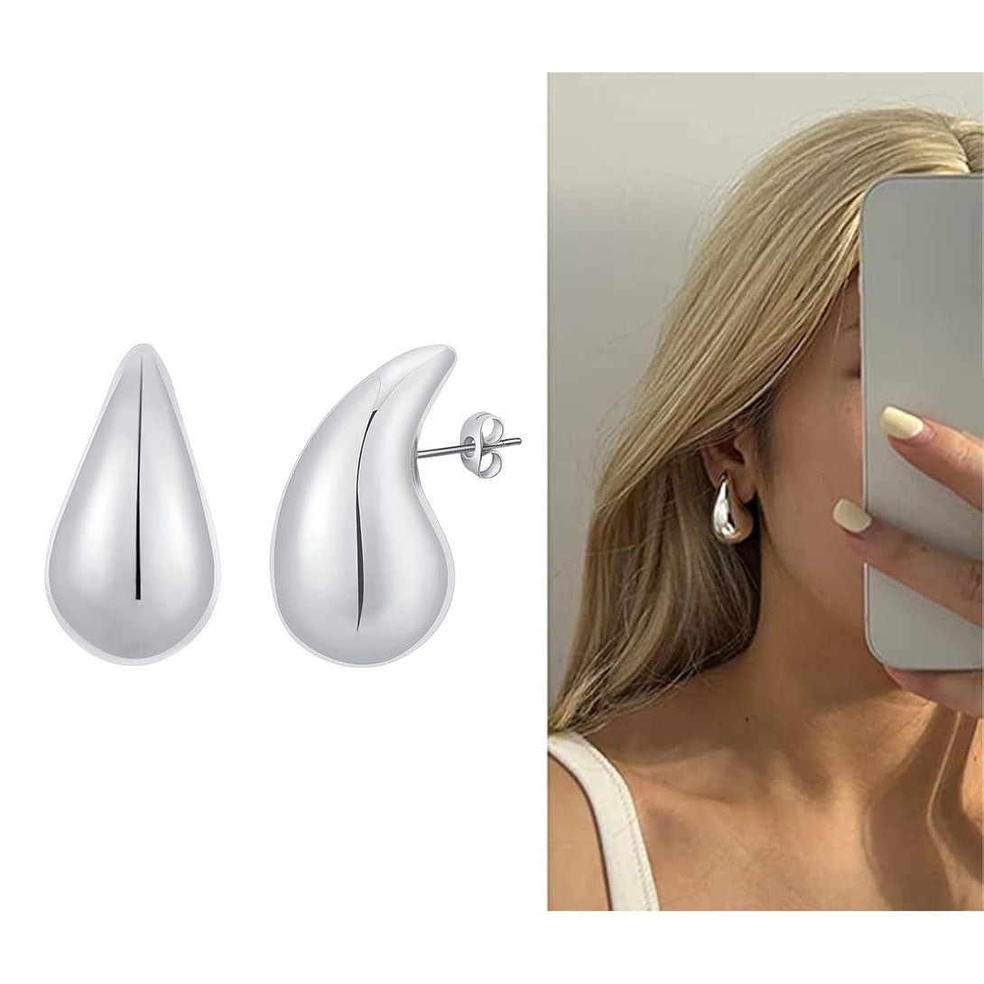 Women’s Glossy Silver Drop Earrings – Modern Chunky Statement Stud Jewelry