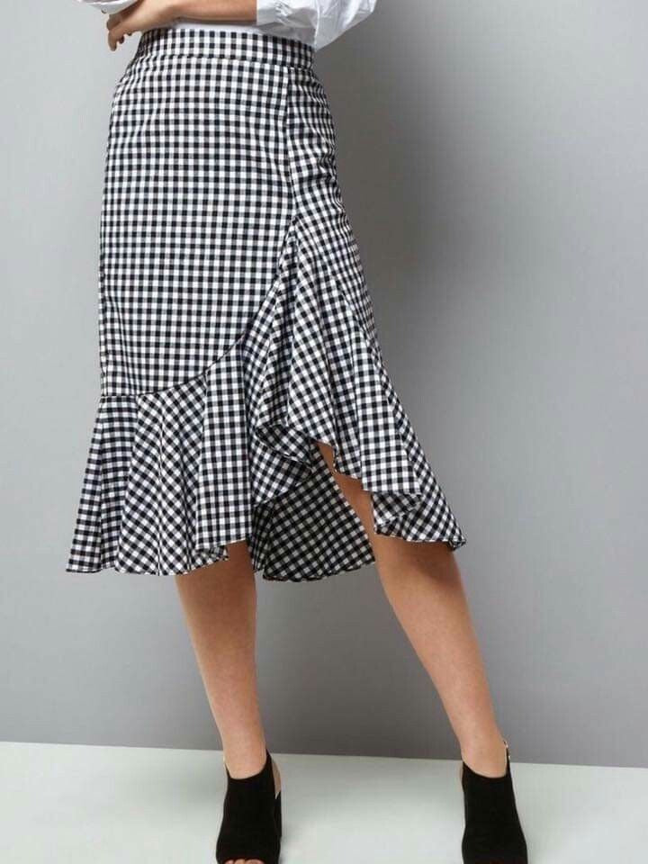 Black White Checkered Midi Skirt, Ruffled Flare Hem, Vintage Chic
